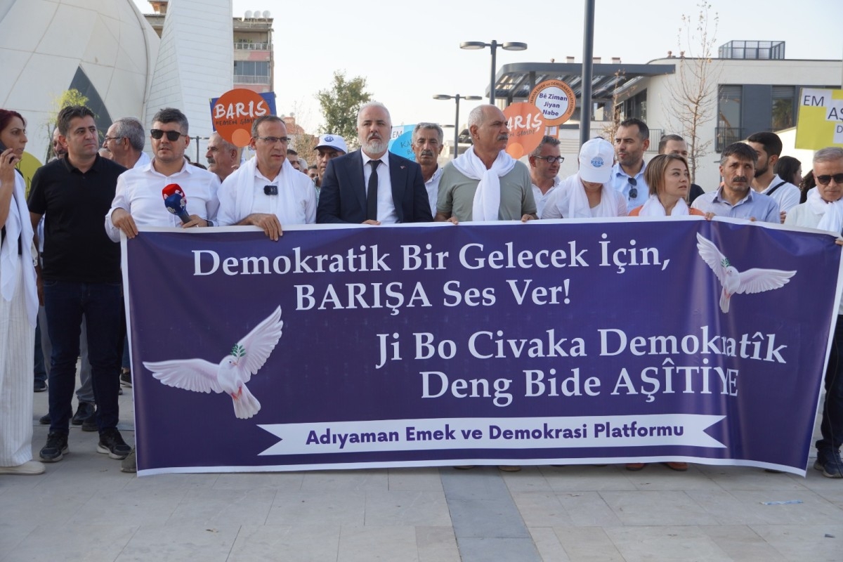 1 Eylül Dünya Barış Günü dolayısıyla, Adıyaman’da Mimar Sinan Kültür Parkı önünde toplanan Emek ve Demokrasi Platformu üyeleri ve çok sayıda vatandaş, barışa yönelik mesajlarını duyurmak amacıyla yürüyüş gerçekleştirdi.